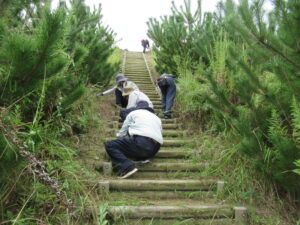 浜松本社の工事部員をはじめ、普段から体を動かすことの少ない総務部・営業部・工務部の社員で防潮堤階段の草取りや植栽されたマツの下枝の剪