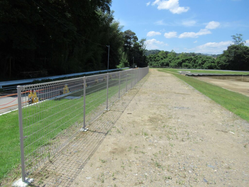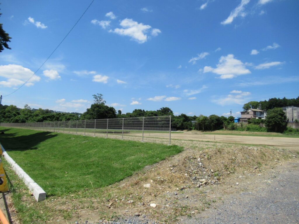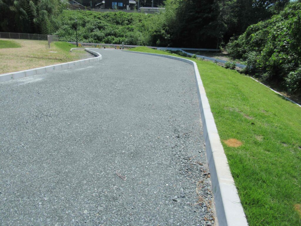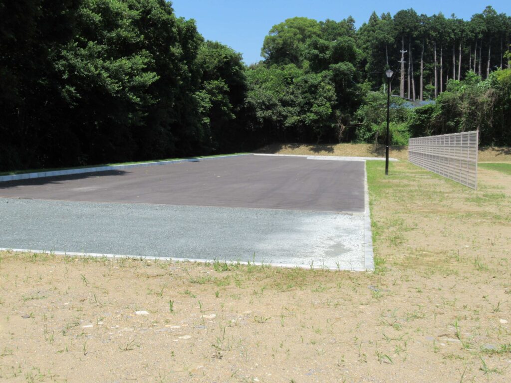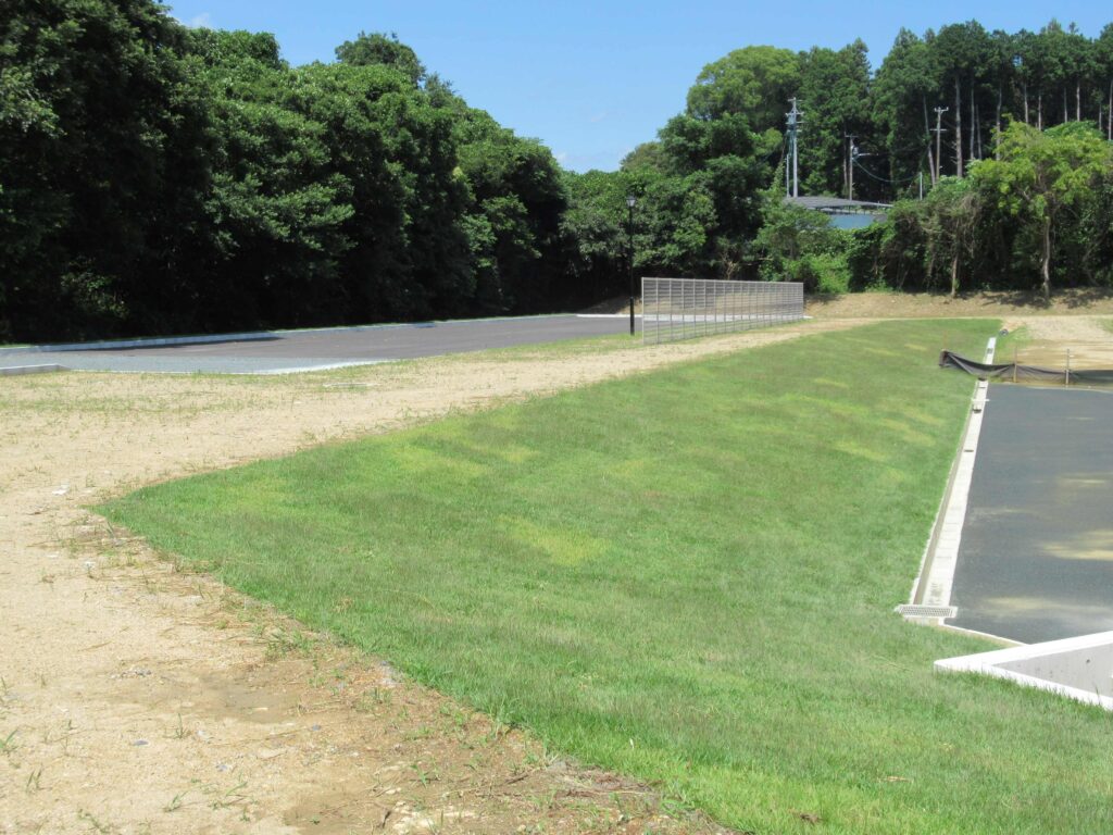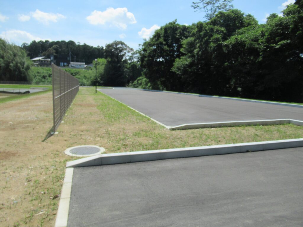 敷地造成(掘削、法面整形)、芝張、集水桝、照明灯、アスファルト舗装、メッシュフェンス、など